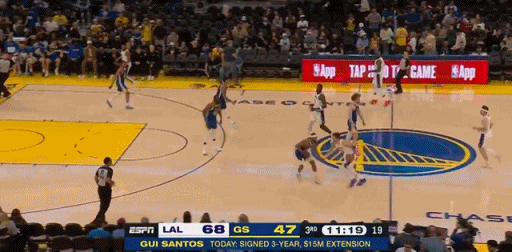 一个仙人指路的四分卫精准长传助,拉拉维亚轻松打进2+1,湖人3节领先30分。